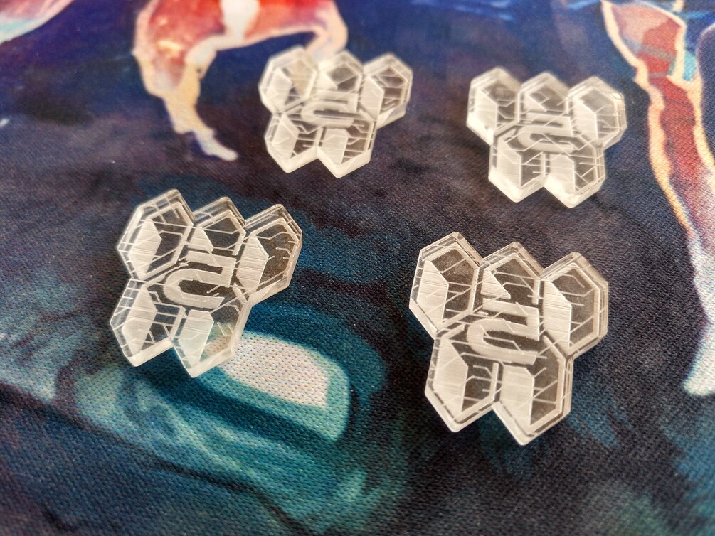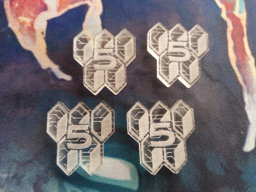 Set of 4 acrylic tokens of 5 credits for your necessities in the cyberpunk future. They are engraved both sides. In the front they have the face value and in the back they have a texture.