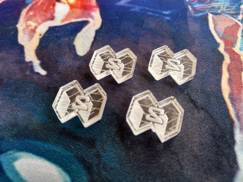 Set of 4 acrylic tokens of 2 credits for your necessities in the cyberpunk future. They are engraved both sides. In the front they have the face value and in the back they have a texture.